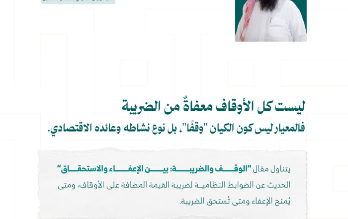 ليست كل الأوقاف معفاةٌ من الضريبة، فالمعيار ليس كون الكيان "وقفًا"، بل نوع نشاطه وعائده الاقتصادي. في مقال: "الوقف والضريبة: بين الإعفاء والاستحقاق" يوضّح نائب الرئيس التنفيذي والمحامي أ. يوسف بن صالح السديس، الأحكام النظامية لضريبة القيمة المضافة على الأوقاف.