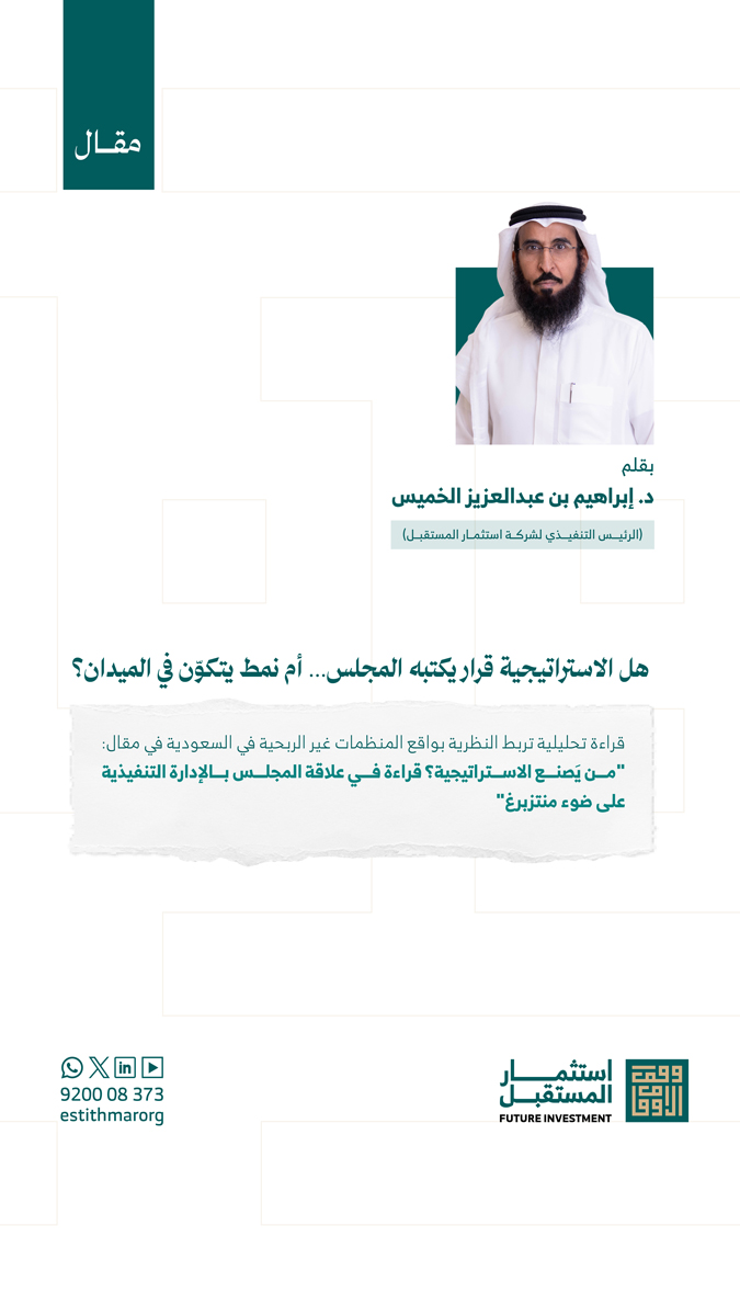 د. إبراهيم بن عبدالعزيز الخميس2026-03-30T14:43:53+03:00هل الاستراتيجية قرار يكتبه المجلس… أم نمط يتكوّن في الميدان؟ قراءة تحليلية تربط النظرية بواقع المنظمات غير الربحية في السعودية في مقال: "من يَصنع الاستراتيجية؟ قراءة في علاقة المجلس بالإدارة التنفيذية على ضوء منتزبرغ"